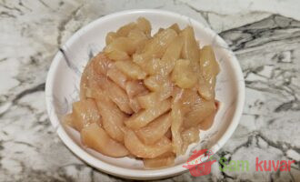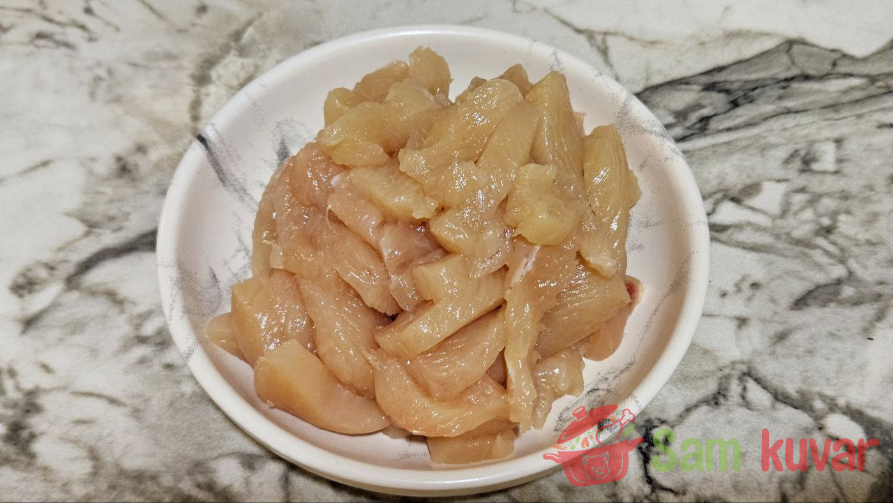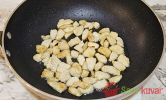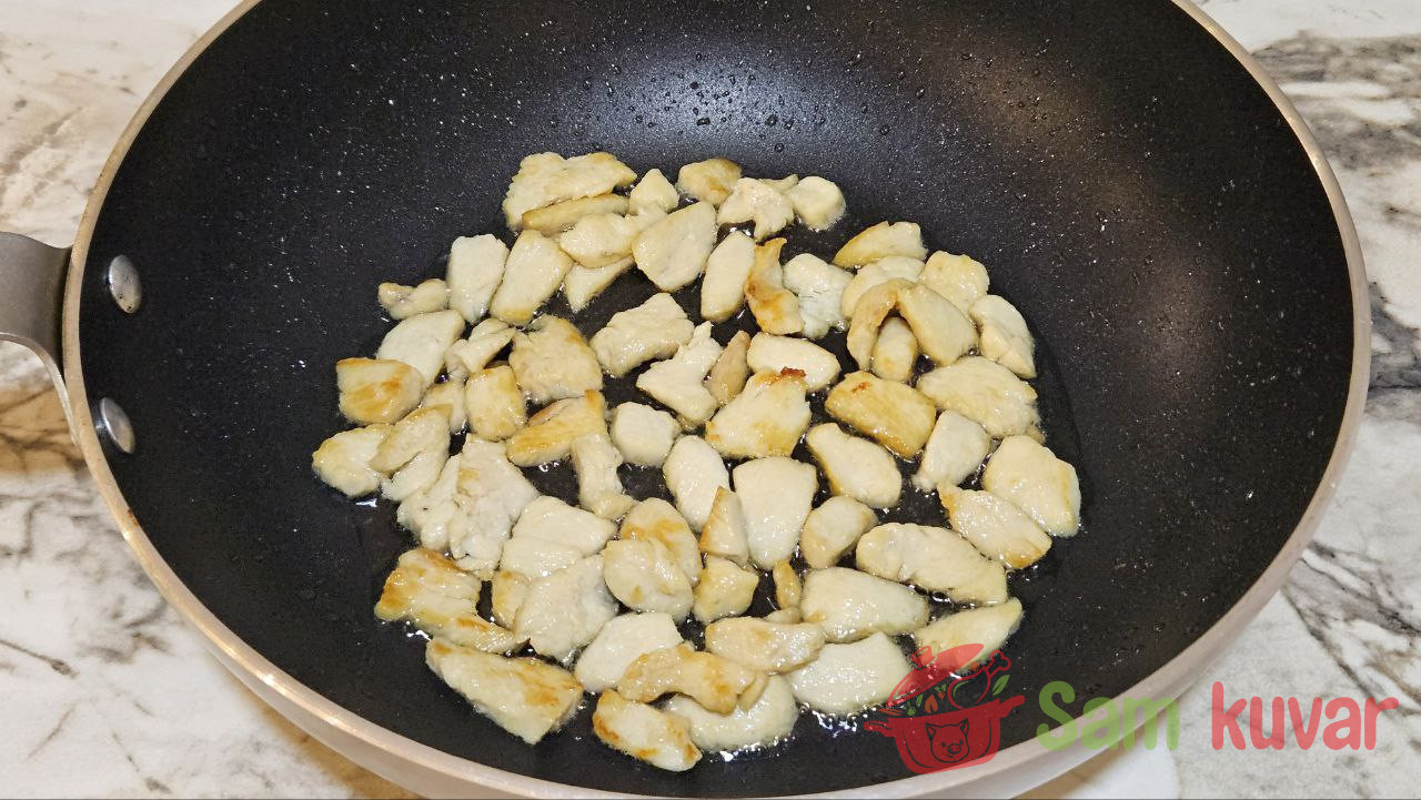 - Ispržite piletinu na zagrejanom tiganju sa malo ulja do gotovosti.