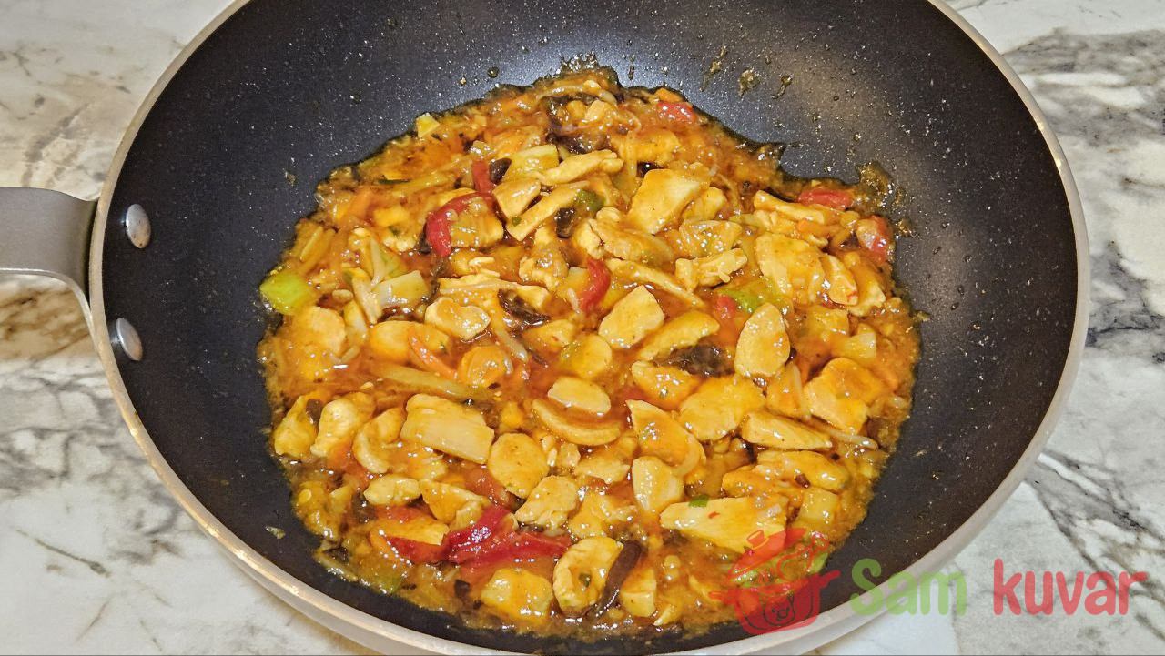 - Dodajte čili sos i dinstajte na laganoj vatri 5 minuta.