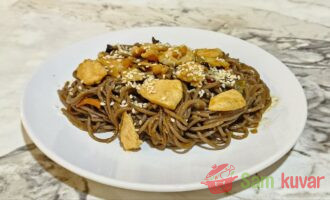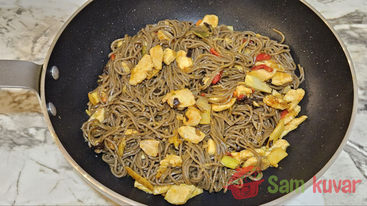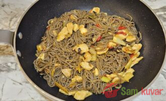 - Skuvajte rezance prema uputstvu na pakovanju, procedite ih i isperite hladnom vodom. Dodajte rezance u piletinu i promešajte.