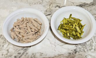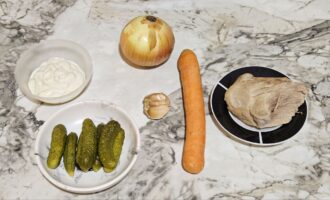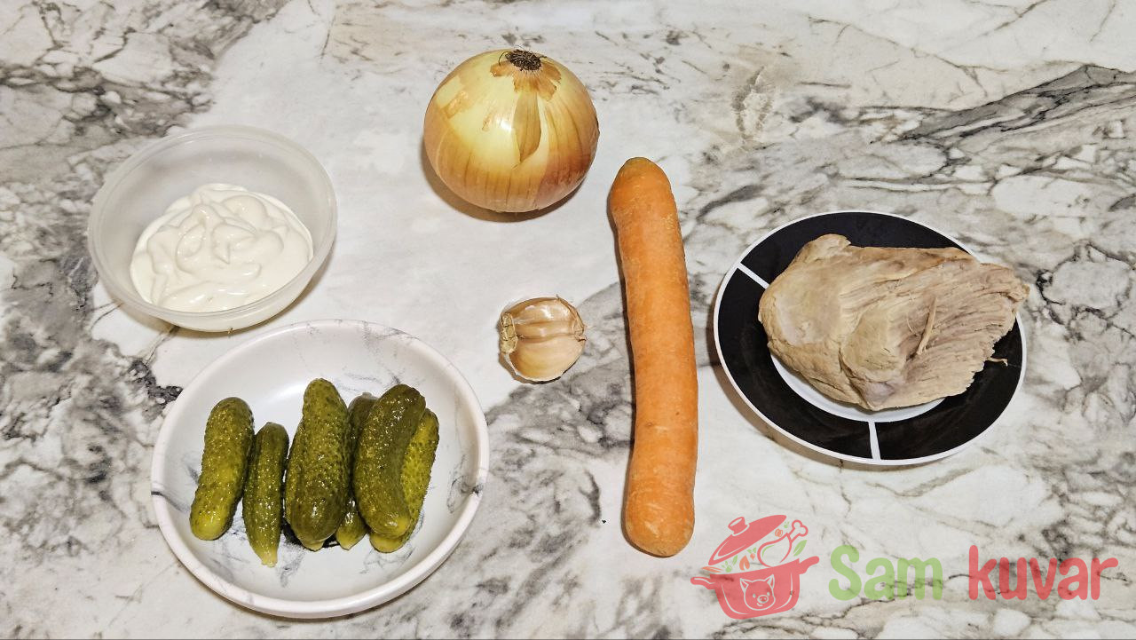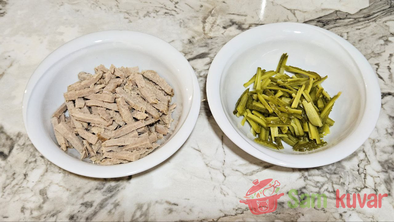 - Dok se luk i šargarepa hlade, meso i kisele krastavce isecite na trakice.