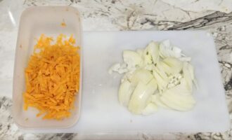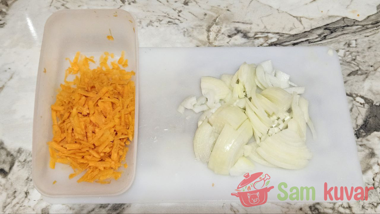 - Crni luk isecite na četvrtine kolutova, a šargarepu narendajte na krupno rende.