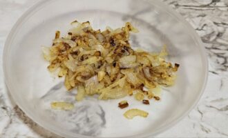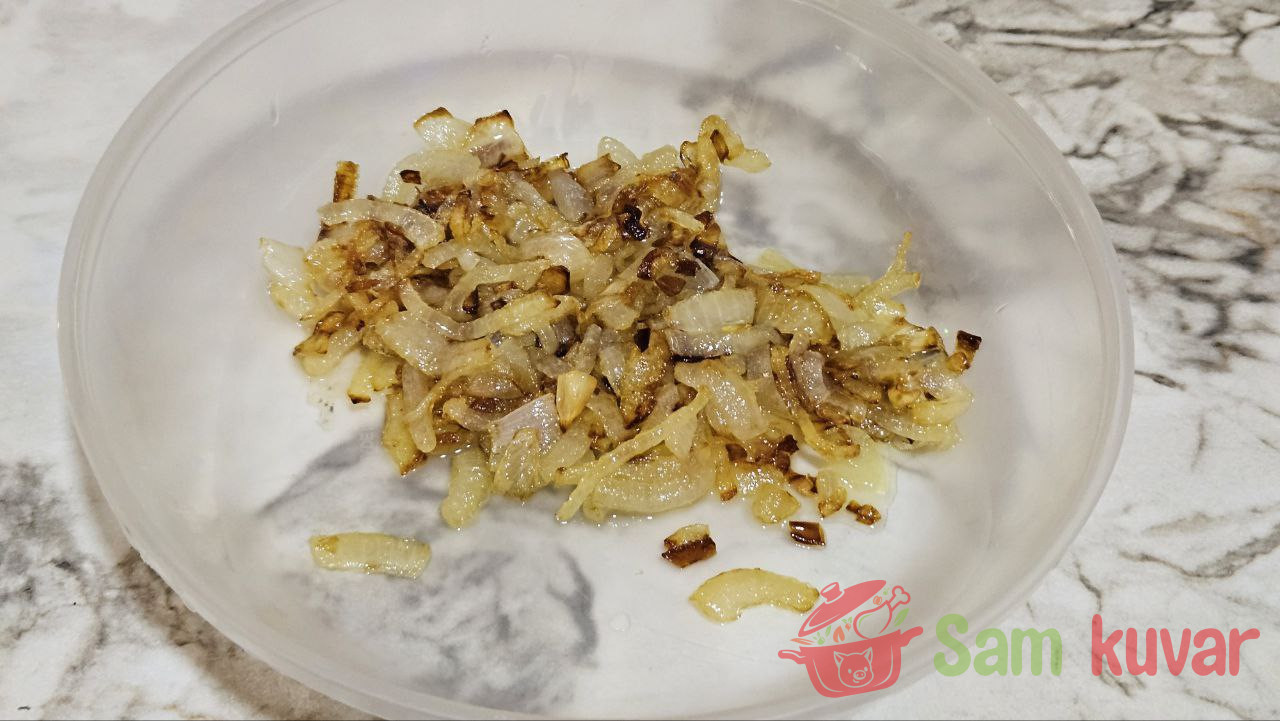- Na zagrejanom tiganju sa malom količinom biljnog ulja propržite luk do zlatne boje i prebacite ga u posebnu činiju.