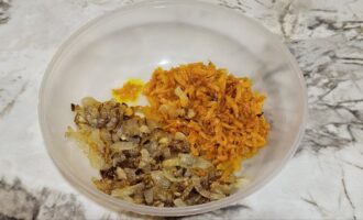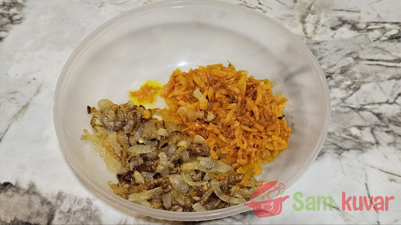 - Na istom tiganju, dodajući još malo ulja, propržite rendanu šargarepu i dodajte je luku.