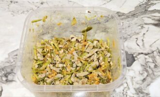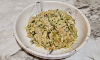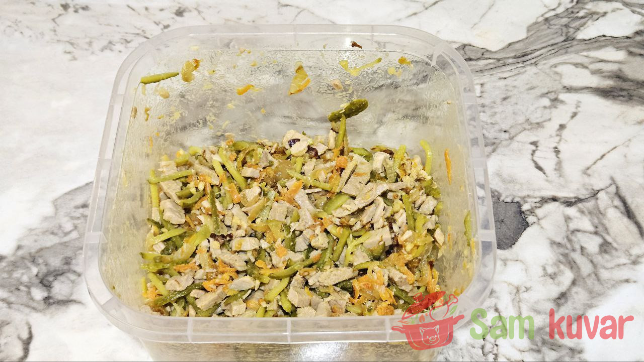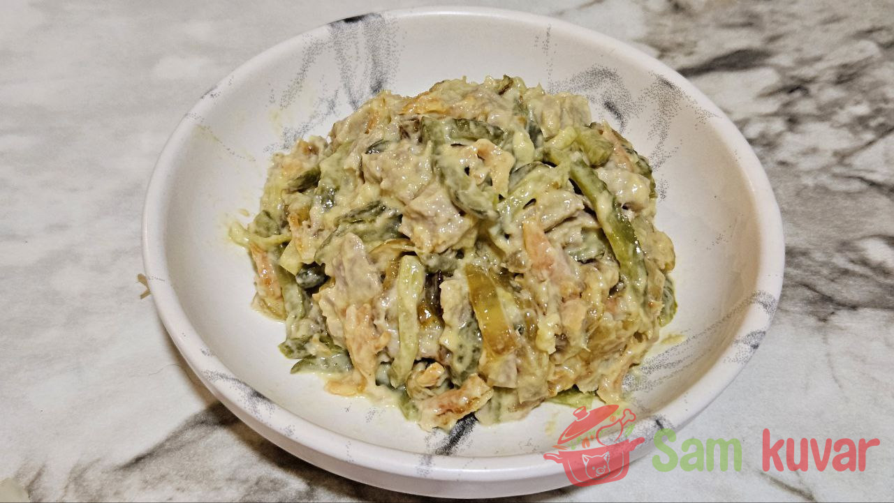 - Dodajte meso i krastavce ohlađenom prženom povrću. Po želji dodajte beli luk kroz presu, posolite i pobiberite po ukusu. Dobro promešajte i začinite salatu majonezom.