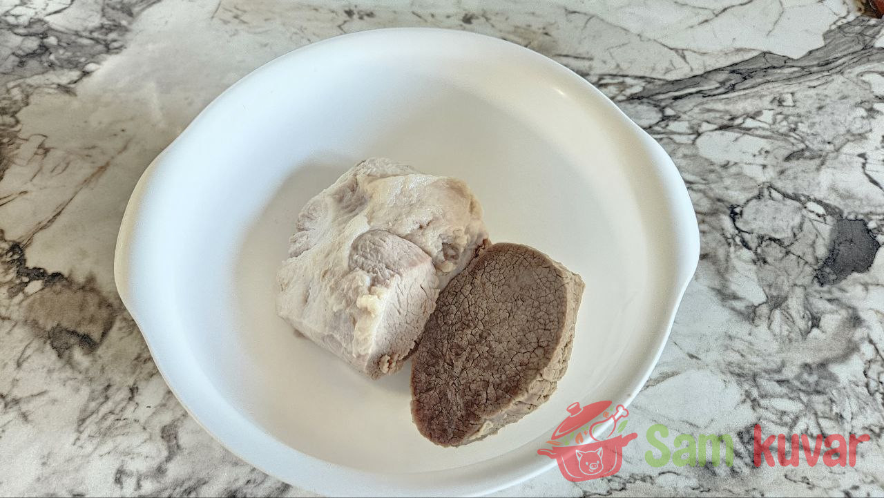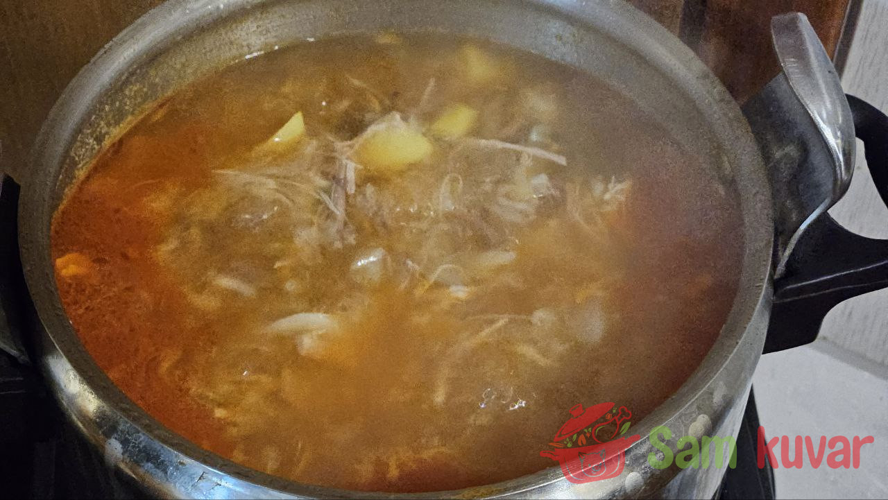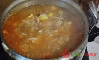 - Najpre skuvajte meso. Što ga duže kuvate, to će supa biti bogatija. Ovde se meso kuvalo 3 sata. Zatim ga izvadite iz bujona, ostavite da se malo prohladi, isecite na komade i vratite nazad u supu.