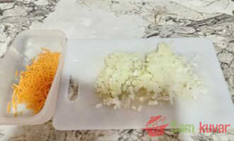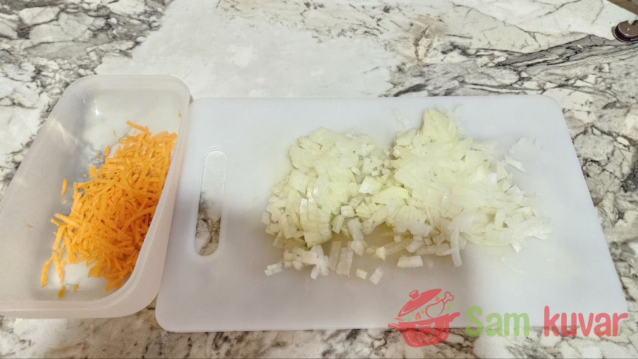 - Dok se krompir kuva, pripremite zapršku: sitno isecite luk, a šargarepu izrendajte. Pržite ih na ugrejanoj tiganju sa malo ulja.