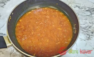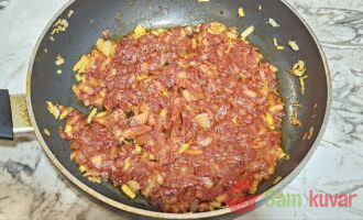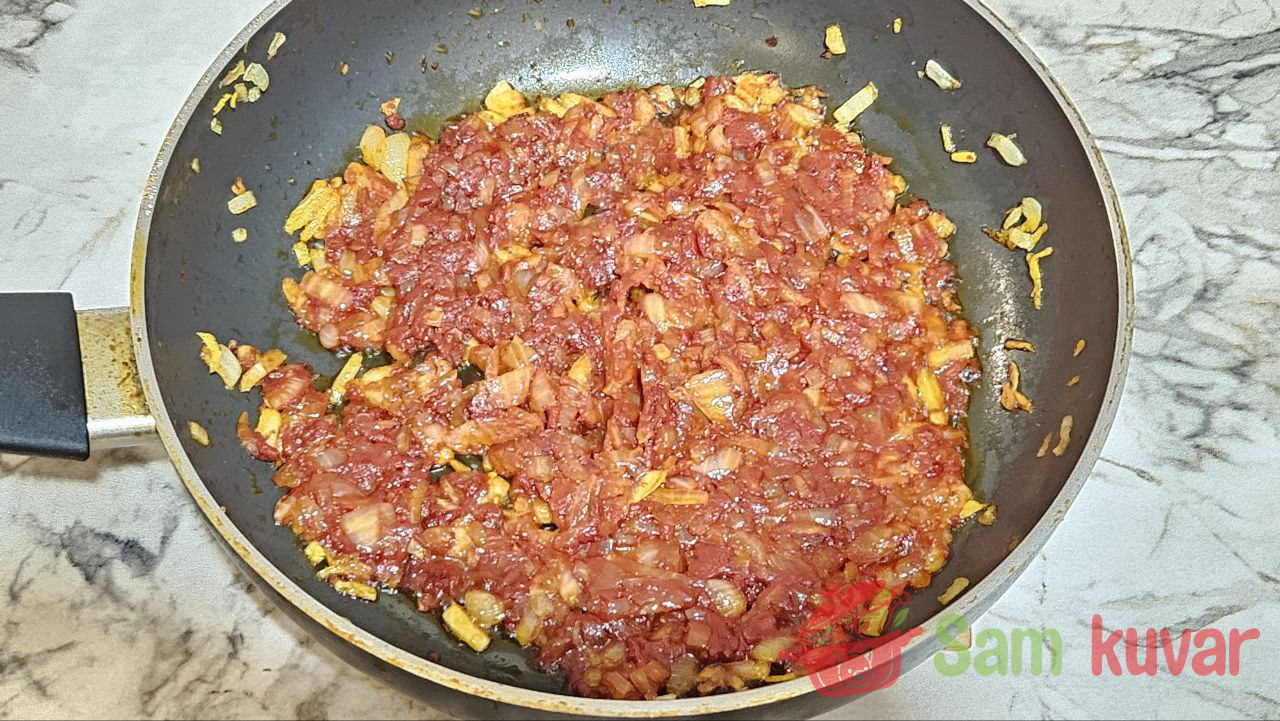 - Kada luk i šargarepa dobiju zlatnu boju, dodajte paradajz pastu i pržite još 2–3 minuta.