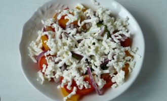 - Preko povrća na krupnoj rendži narendati sir. Ponovo preliti maslinovim uljem.