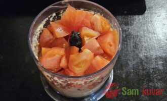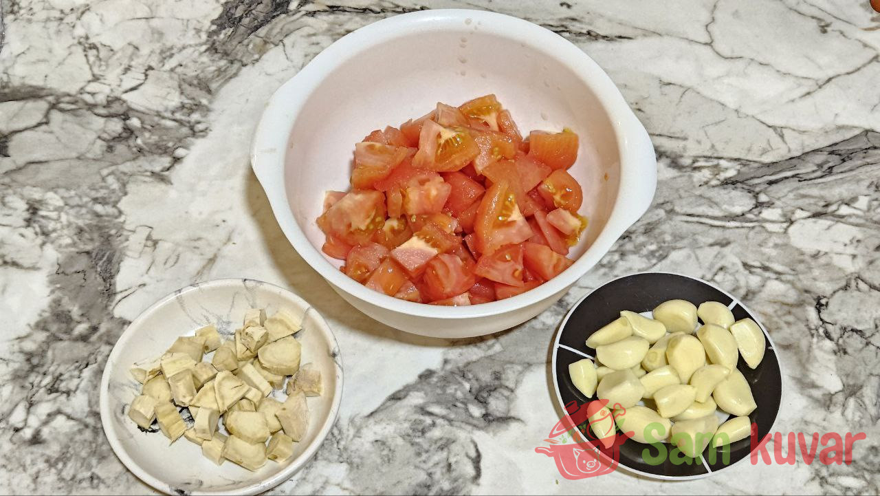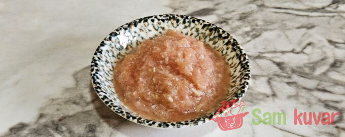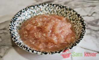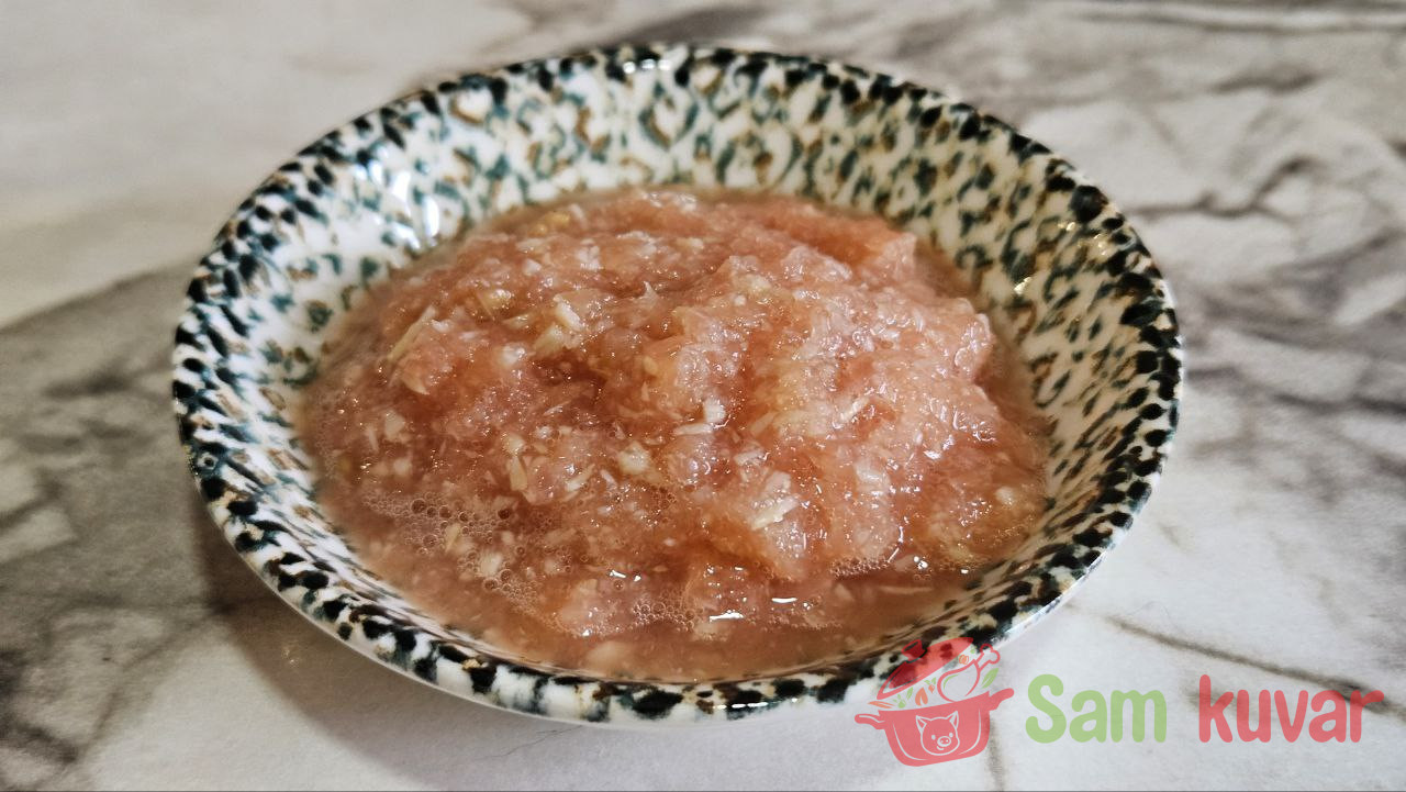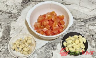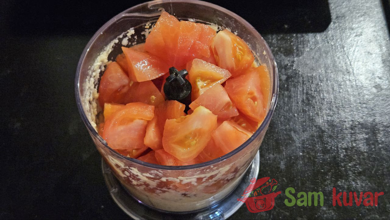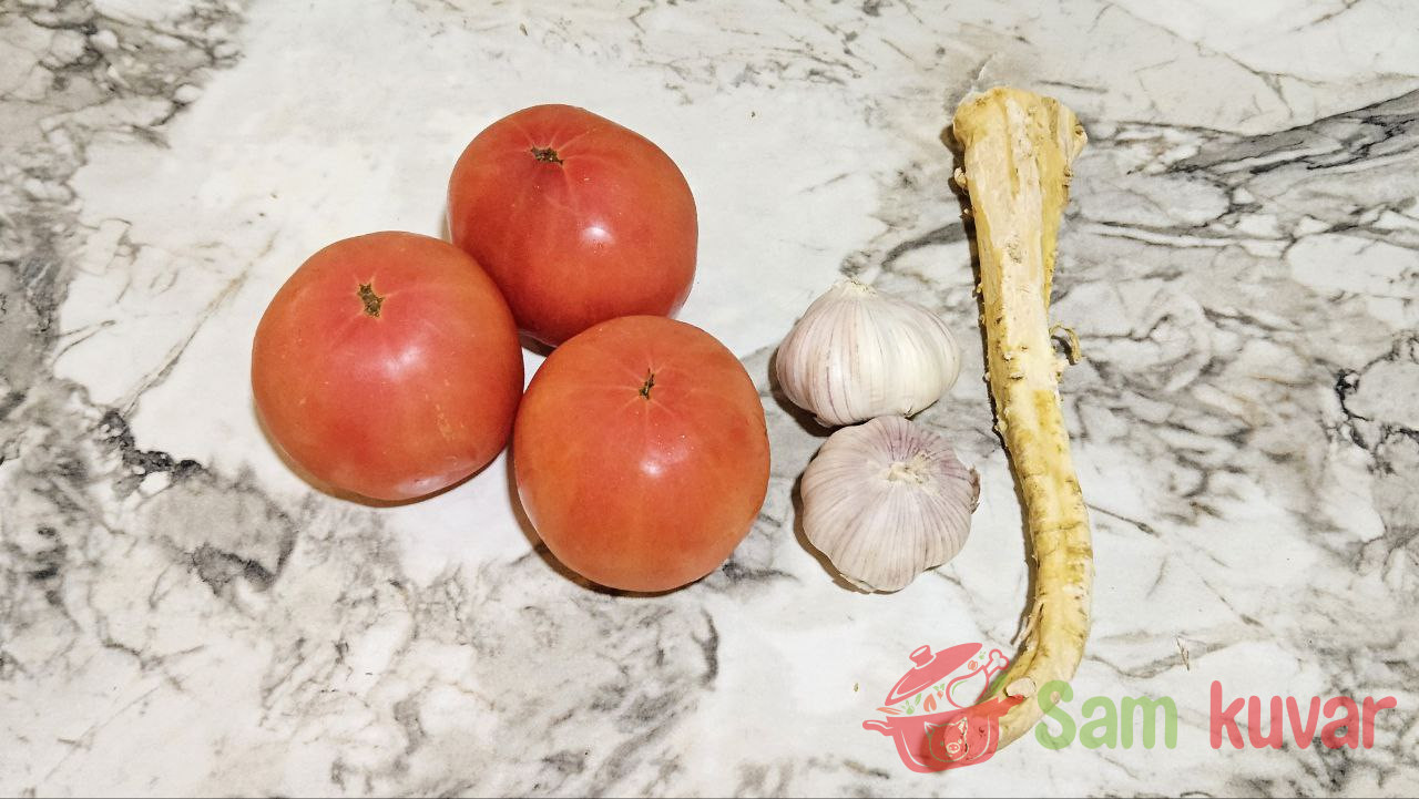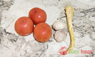 - Sa paradajza je potrebno skinuti kožicu. Da biste to uradili, stavite paradajz u vruću vodu na 5 minuta. Voda treba da bude veoma topla, ali da ne kuva. Koren rena i beli luk takođe je potrebno oljuštiti. Sve sastojke isecite na komade pogodne za blender.