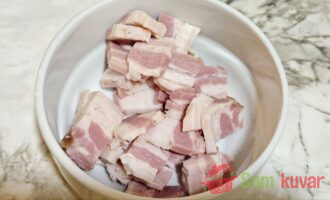 - Isecite slaninu na manje komade. Istovremeno stavite da se kuvaju špageti prema uputstvu sa pakovanja.