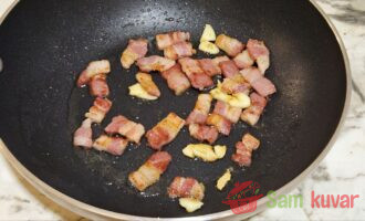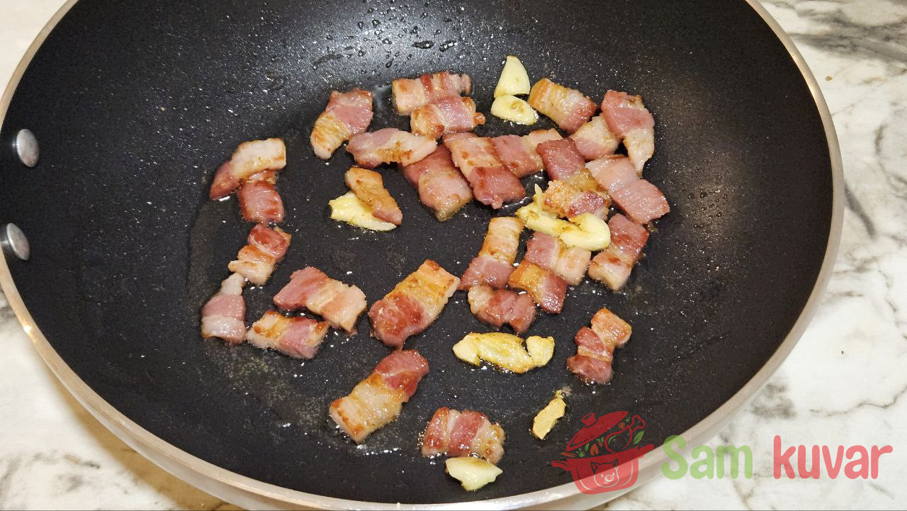 - Na suvom zagrejanom tiganju ispržite slaninu. Kada se malo istopi masnoća, dodajte zgnječeni beli luk kako bi masnoća upila njegovu aromu. Izvadite slaninu, a beli luk bacite nakon prženja.