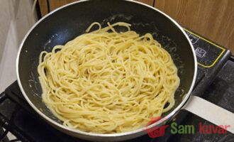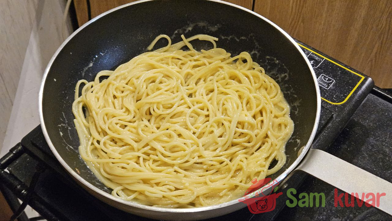 - Kuvane špagete stavite u tiganj u kojem se pržila slanina i dobro promešajte jedan minut da upiju masnoću i aromu belog luka. Zatim isključite šporet, dodajte sos u špagete i sve dobro promešajte.