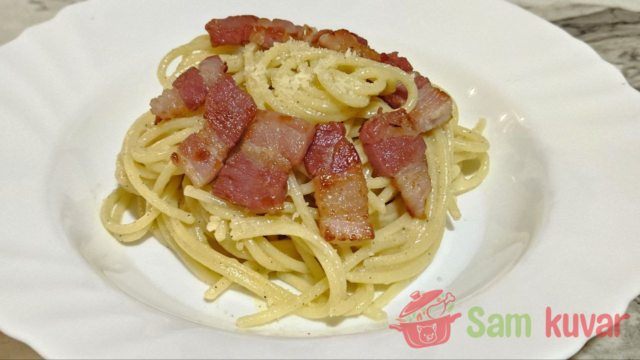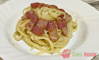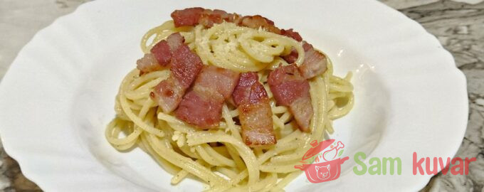 - Odmah poslužite špagete, stavite preko komade slanine i pospite parmezanom. Prijatno!