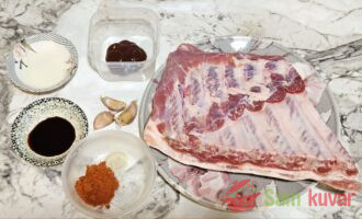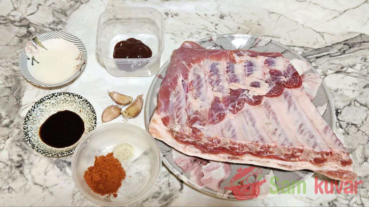 - Pripremite potrebne sastojke za pripremu svinjskih rebara BBQ.