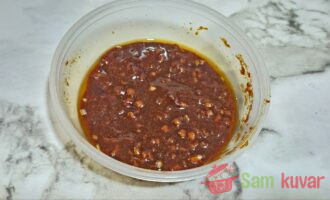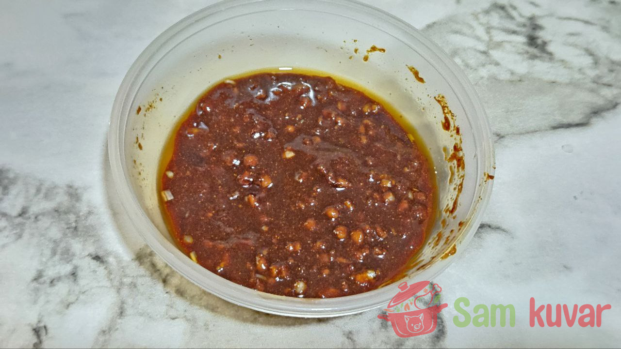 - Pripremite marinadu: Pomešajte soja sos i biljno ulje, protisnite beli luk kroz presu, dodajte sušenu papriku, so i biber. Dobro promešajte.