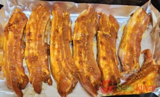- Stavite rebra u zagrejanu do 200°C rernu i pecite 1 sat. Zatim uklonite list folije i četkicom premažite svako rebro barbecue sosom. Stavite u rernu na 160°C otvorena rebra na 30 minuta.