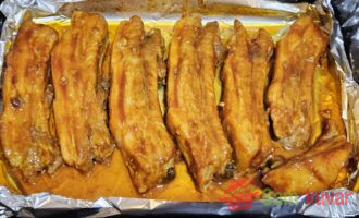 - Isecite svinjska rebra i dobro premažite svaki komad marinadom. Ostavite da se mariniraju najmanje 1 sat. Zatim stavite rebra u tepsiju i prekrijte listom folije.