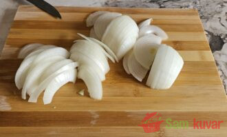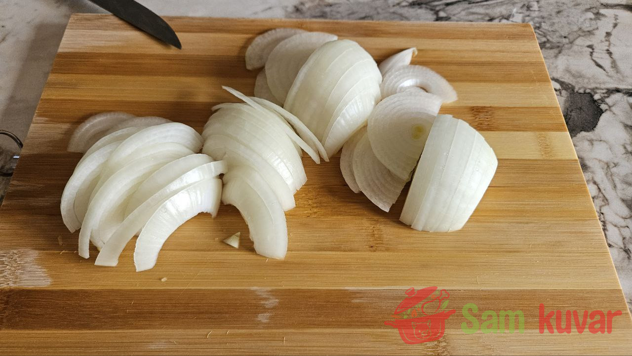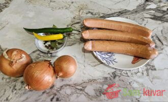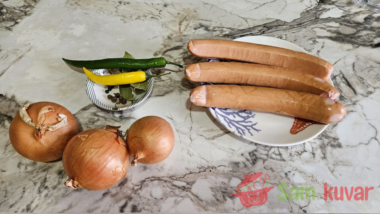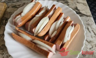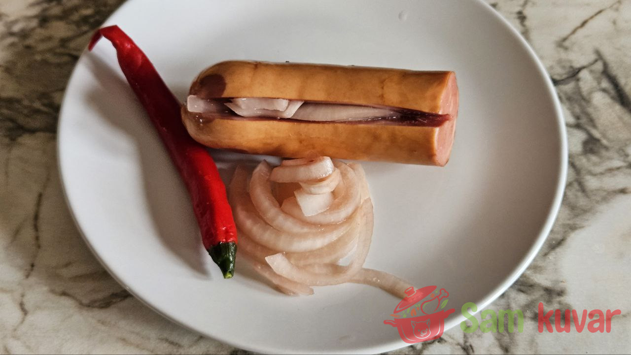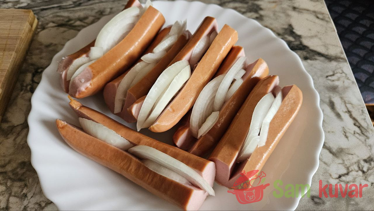 - Mesne kobasice zarežite uzdužno i dobro napunite rezove lukom.