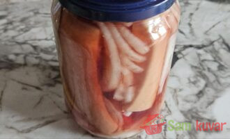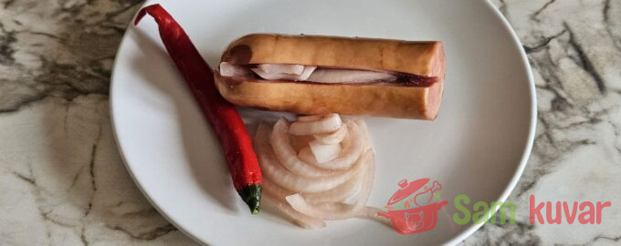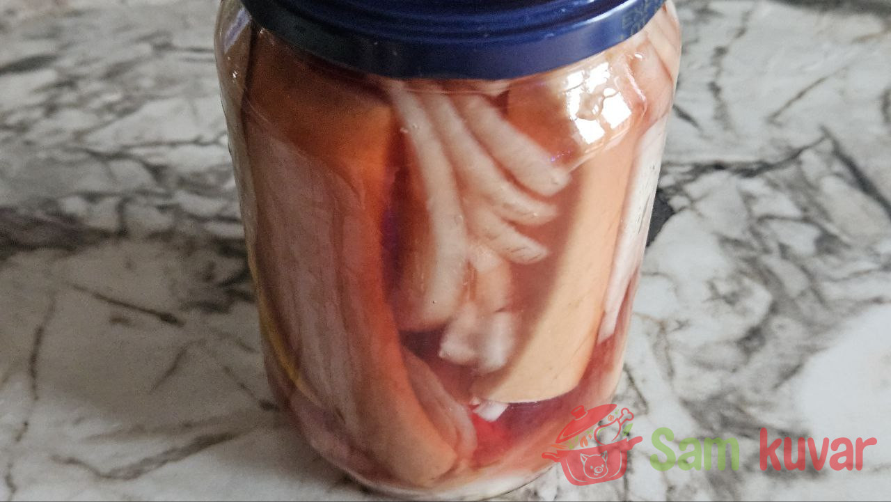 - Na dno tegle stavite sloj luka, zatim poređajte mesne kobasice, a između dodajte još luka i ljutu papriku. Kada se rasol ohladi, napunite teglu rasolom. Potrudite se da u tegli ostane što manje vazduha. Teglu stavite u frižider na 10 dana.