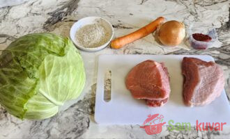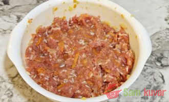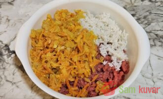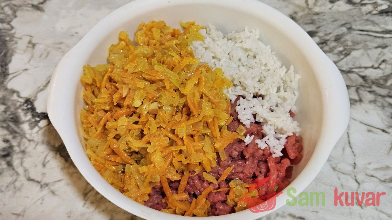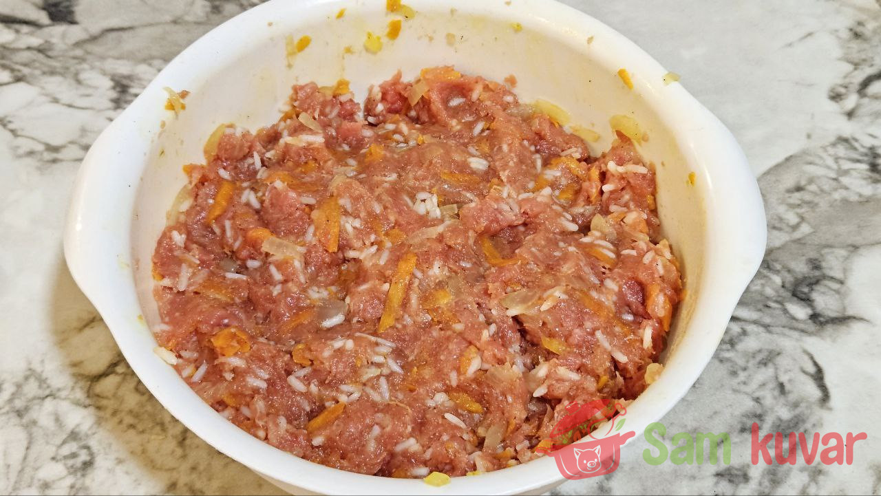 - Sameljite goveđe i svinjsko meso kroz mašinu za mlevenje mesa. Dodajte u mleveno meso pirinač i proprženo povrće.
