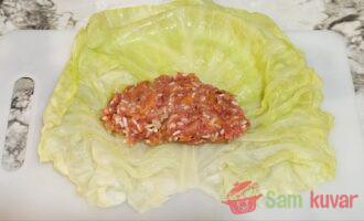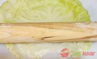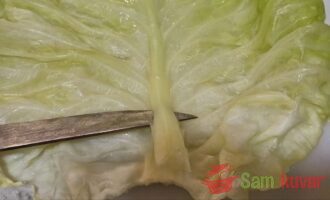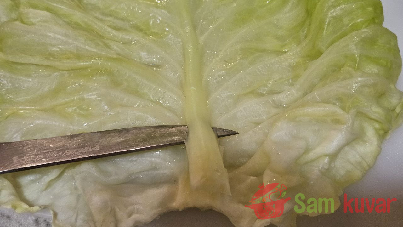- Počnite da formirate sarme. Uzmite list kupusa i izrežite tvrdi deo.