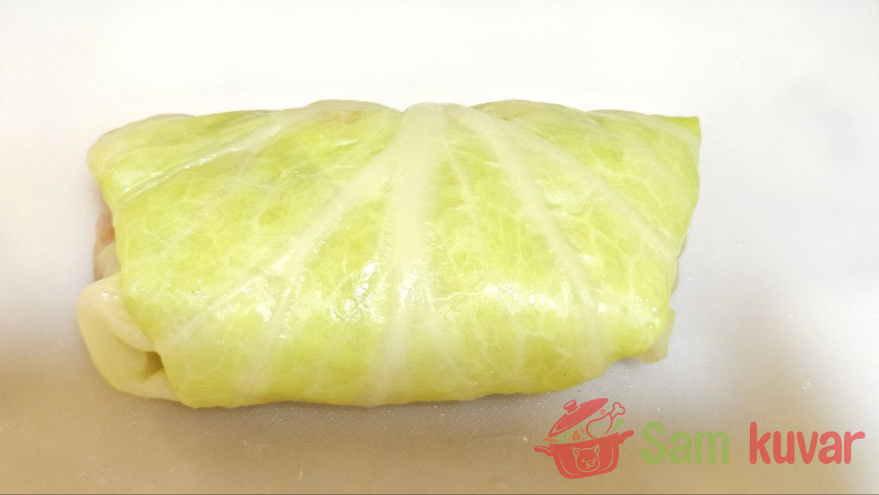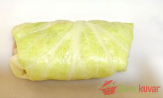 - Zavijajte sarmu: prvo preklopite donji deo preko nadeva, zatim bočne strane, pa urolajte do kraja.