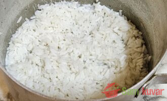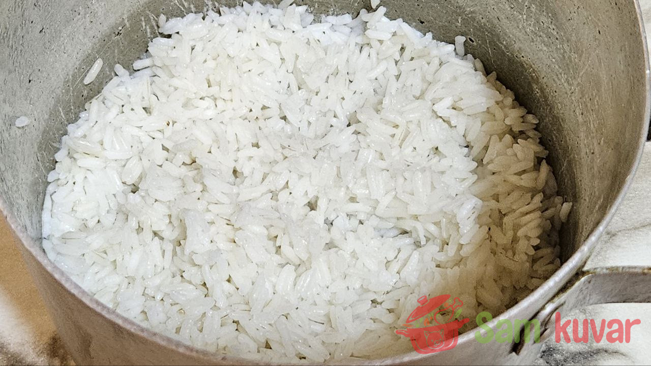 - Operite pirinač i skuvajte ga do polugotovog stanja u razmeri 1:1 sa vodom. Posolite tokom kuvanja, pa ostavite da se ohladi.