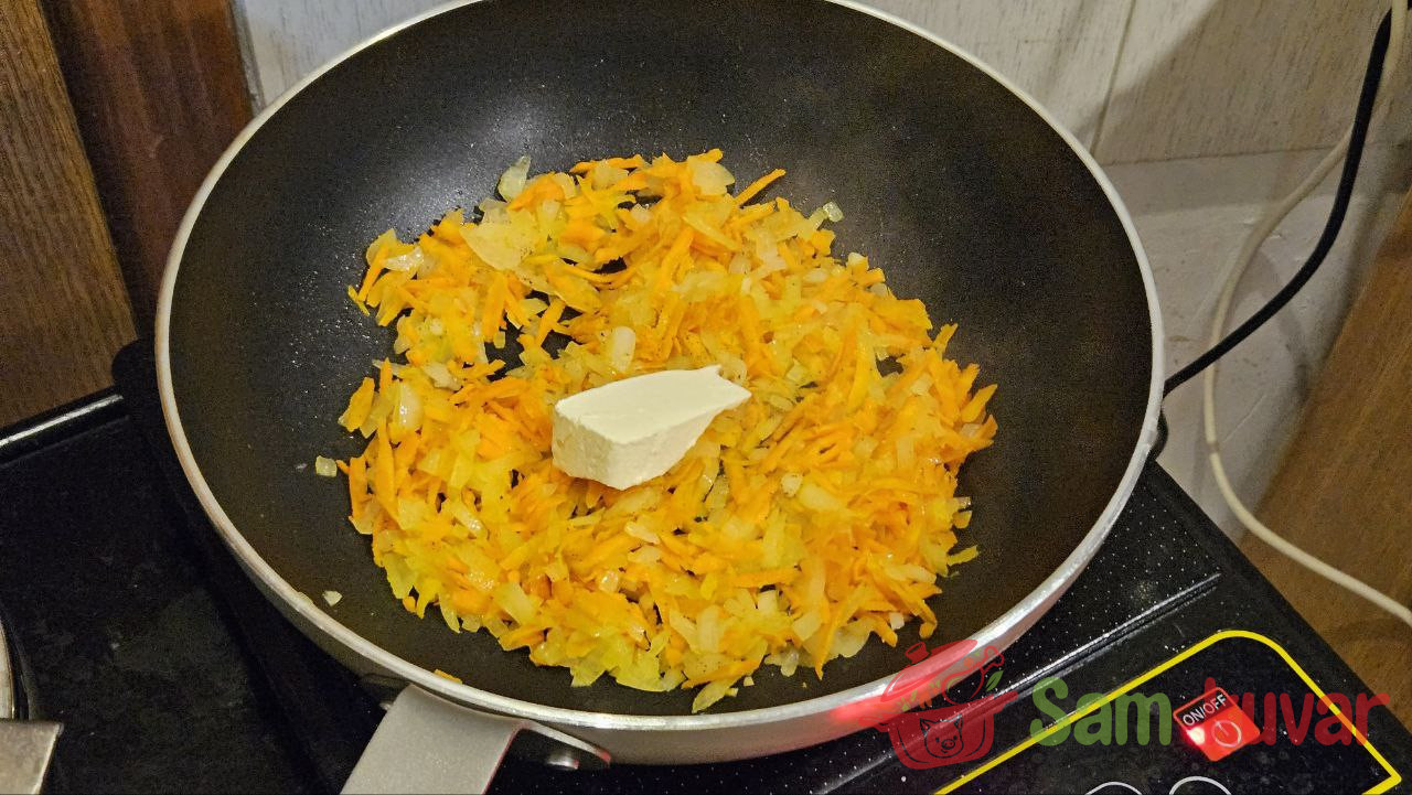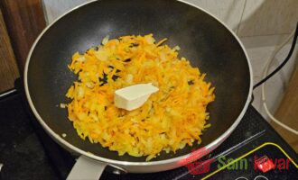 - Na tiganju sa malo ulja propržite luk i šargarepu. Na kraju dodajte maslac i pržite još kratko dok se ne otopi.